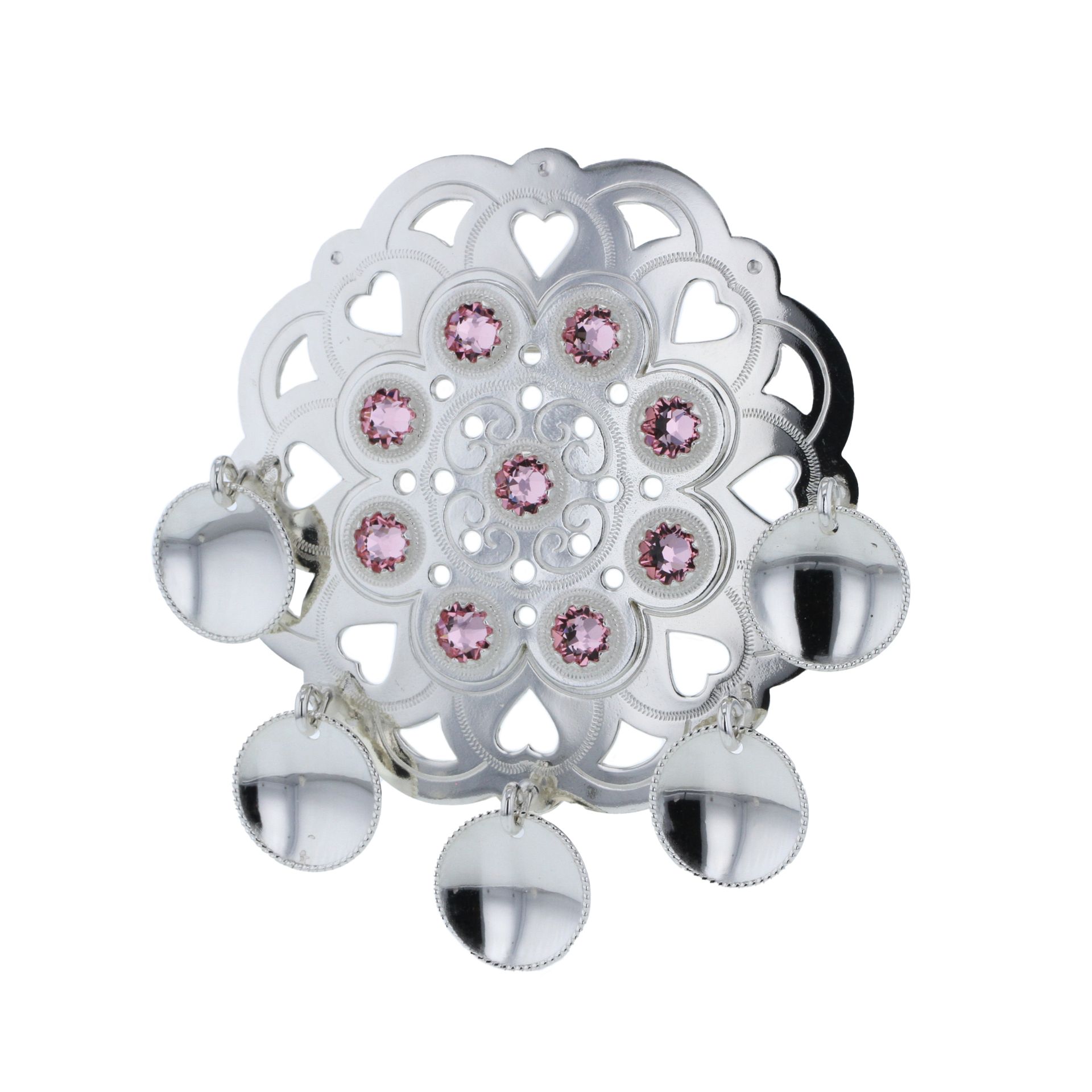 Sølje gravert med hjartemønster, fem lauv og krystallar! Lauv: 18 m/m. D: 8,5 cm.