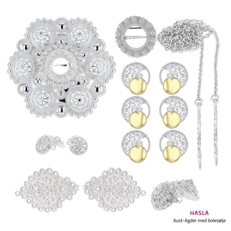 Denne bunadsølvpakka er satt saman som eit forslag til Aust-Agder bunaden, og den inneheld dei klassiske sølje- og sølvprodukta som du treng. Perfekt for deg som skal kjøpe bunadssølv for første gang, og som ønskjer på ein enkel måte å bestille eit komplett sett. Pakken inneheld: