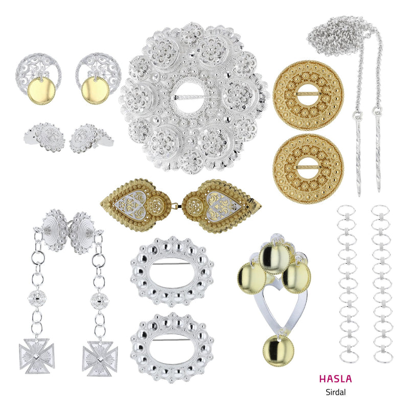 Denne bunadsølvpakka er satt saman som eit forslag til Sirdalbunaden, og den inneheld dei klassiske sølje- og sølvprodukta som du treng. Perfekt for deg som skal kjøpe bunadssølv for første gang, og som ønskjer på ein enkel måte å bestille eit komplett sett. Pakken inneheld: