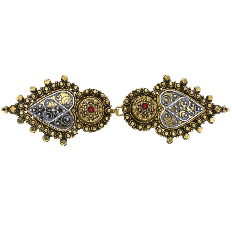 Stor tofarga filigranspenne med krystall i antikkforgylt og oksidert sølv. Denne er uten nål og sys på. Fint tilskudd til bunaden med vakre detaljar. Perfekt for deg som ønskjer å komplettere bunadsantrekket med eit varig og stilig sølvarbeid.