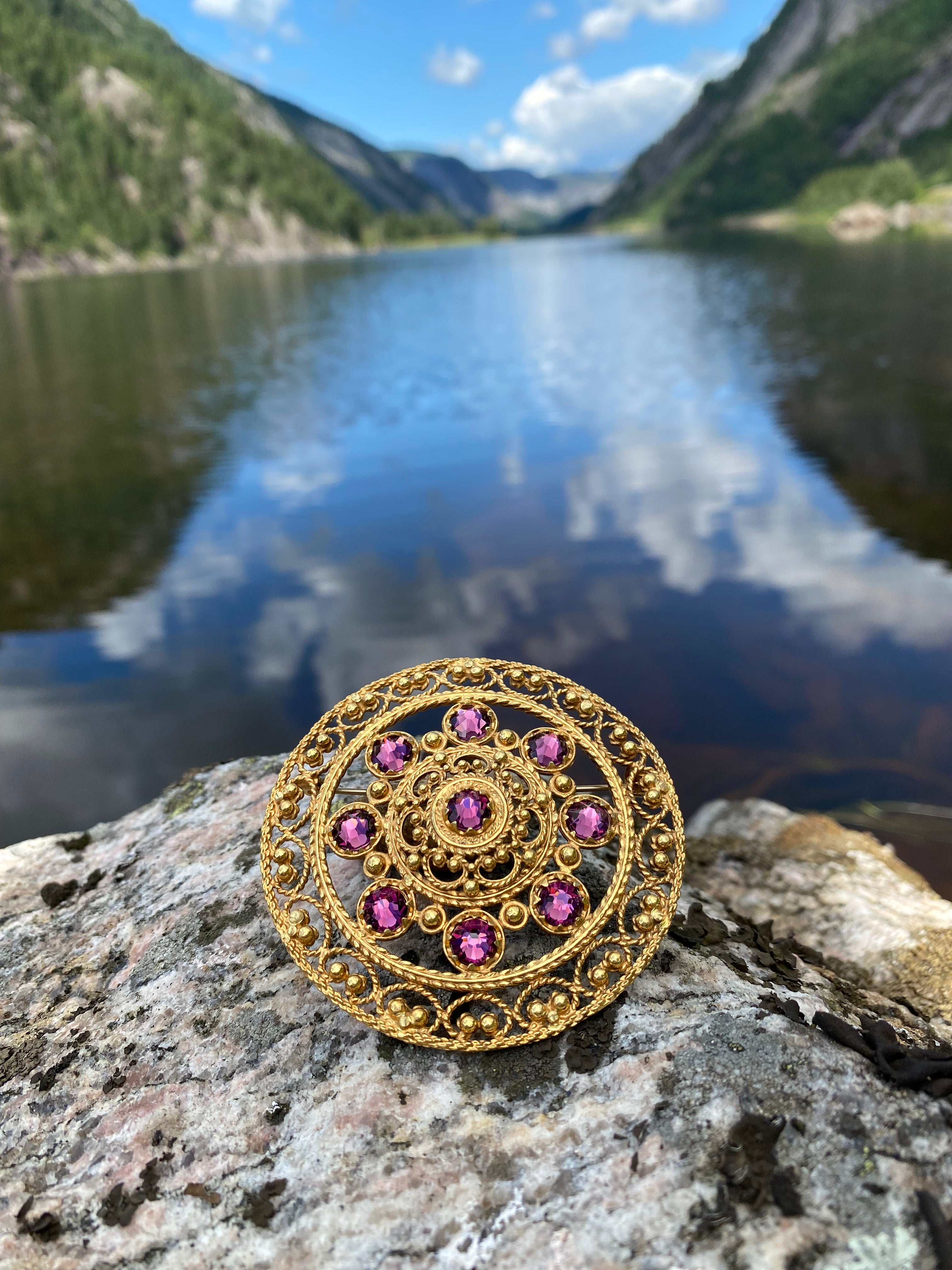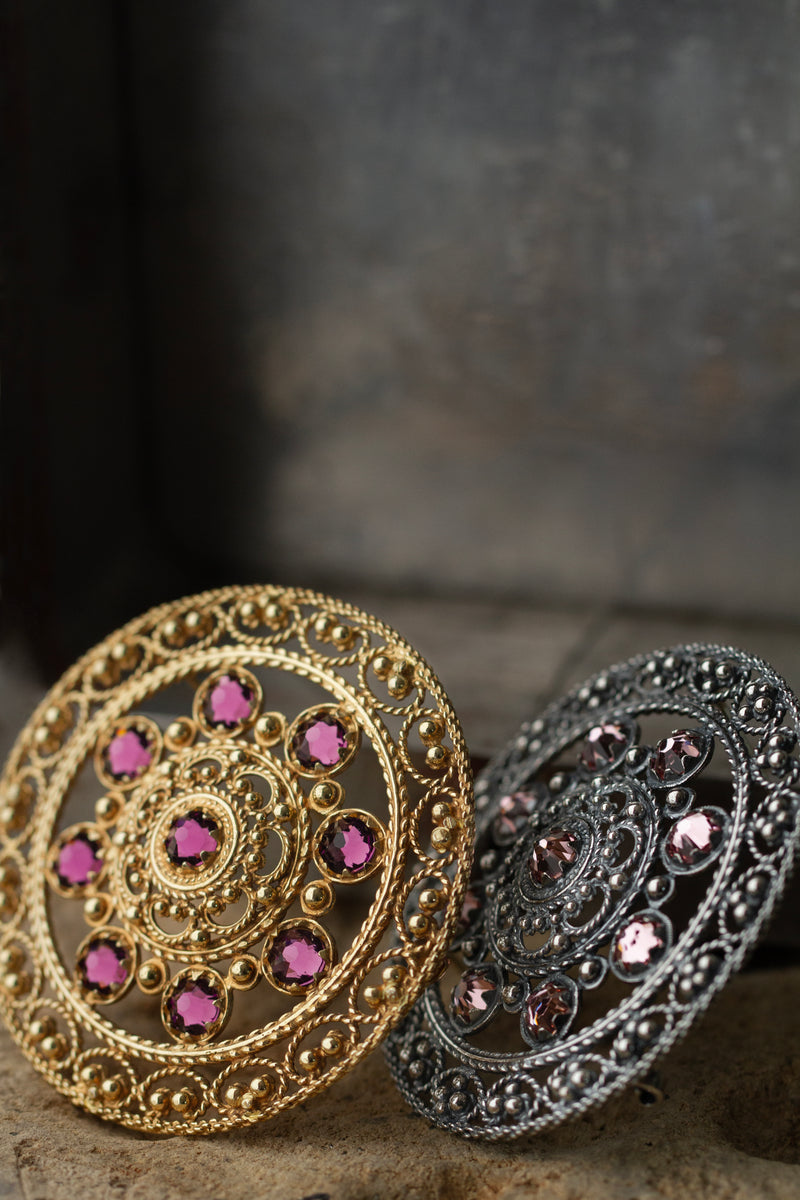 Nål med krystall i antikkforgylt sølv med nydelig filigransdekor. Du har moglegheit til å velje krystallfarge sjølv frå fargekartet, så nåla kan tilpassast akkurat din stil og drakt.