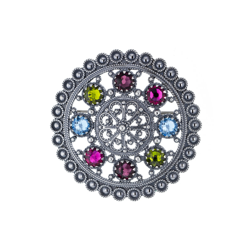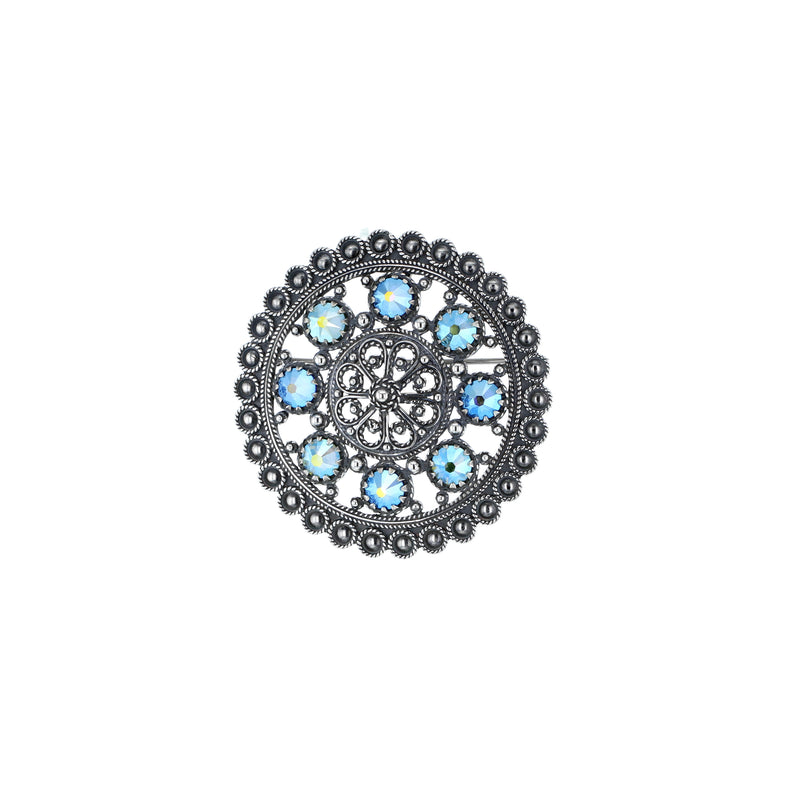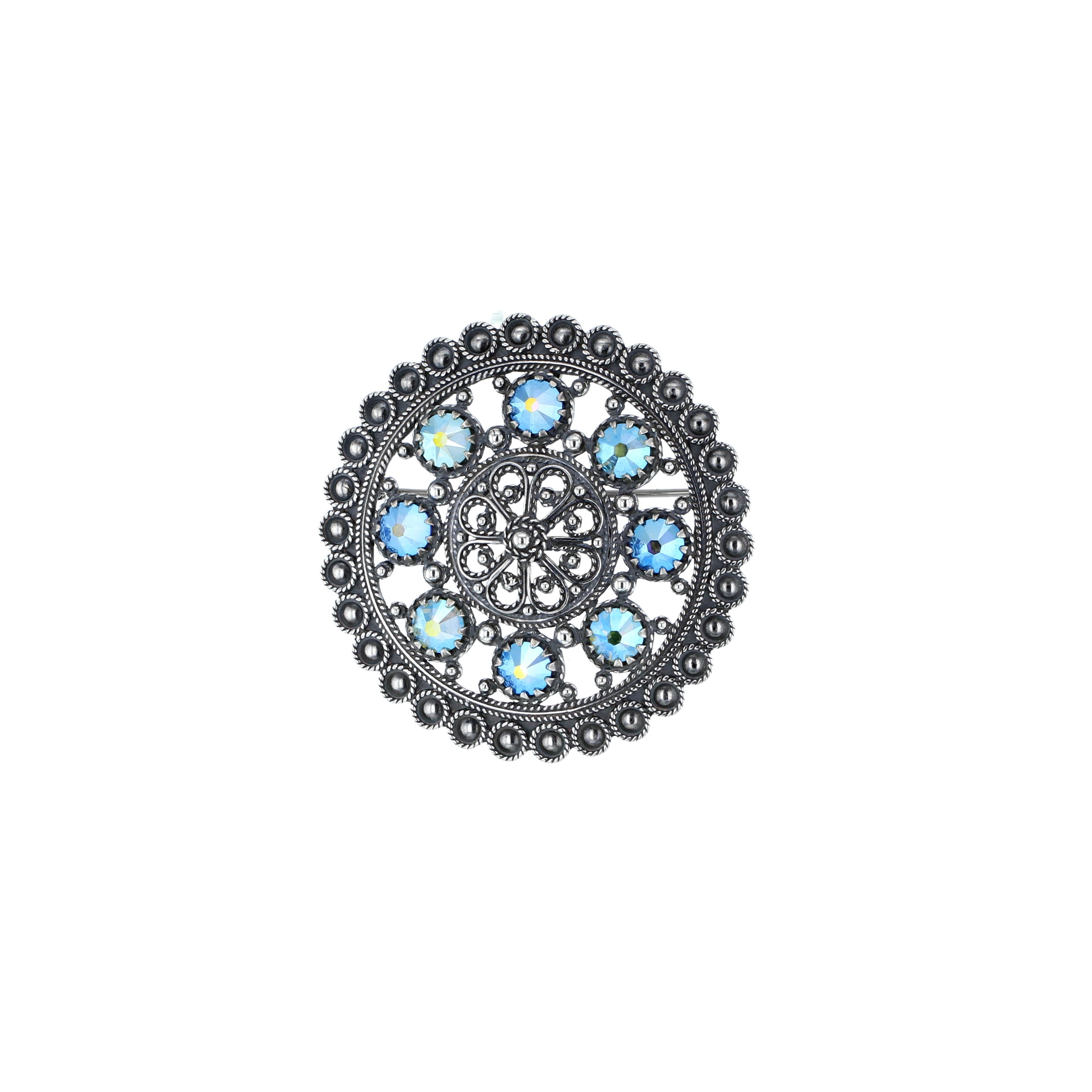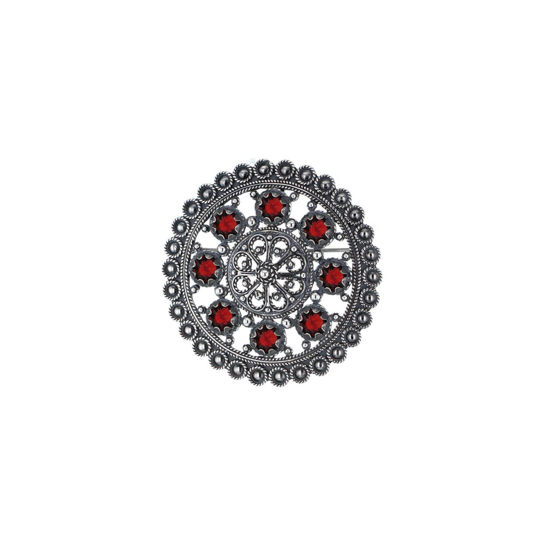 Nål med krystallar og midtrose. Det er hempe på baksida til kjede. Du har moglegheit til å velje krystallfarge sjølv frå fargekartet, så sølja kan tilpassast akkurat din stil og drakt.
