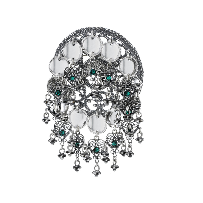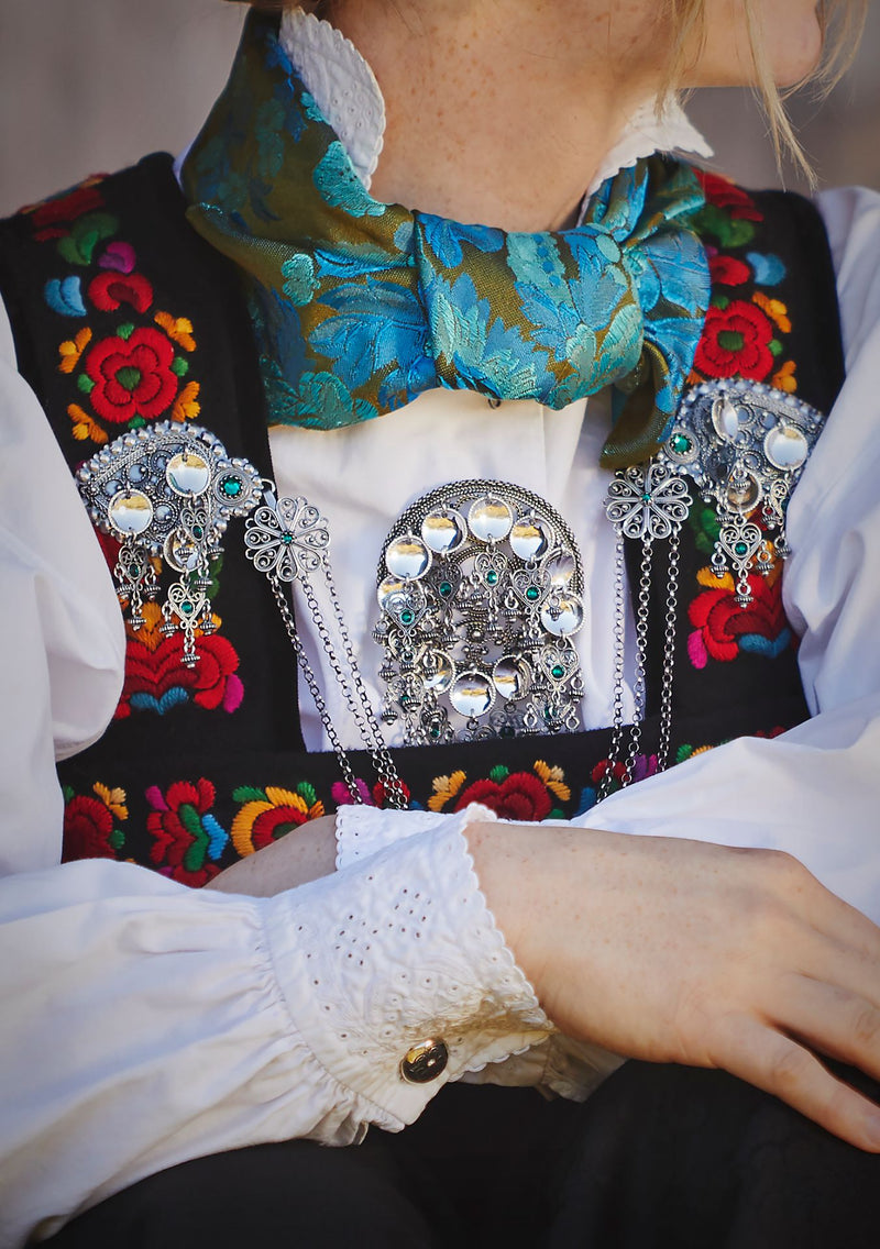 Rosesølje med krystall og krusar i oksidert sølv med blanke lauv. Denne sølja gjev bunaden eit rikt og tradisjonsrikt preg. Laga i høg kvalitet og med ein eleganse som set seg, både til fest og høgtid. Laga med filigransteknikk.