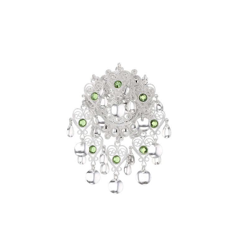 Sølje med krystall og hjarteheng i sølv med blanke lauv. Detaljrik sølje med filigransdekor og ulike lauv. Passar til mange bunader.