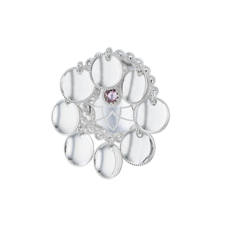 Gravert sølje med 8 lauv og krystall i midten. Du har moglegheit til å velje krystallfarge sjølv frå fargekartet, så sølja kan tilpassast akkurat din stil og drakt.
